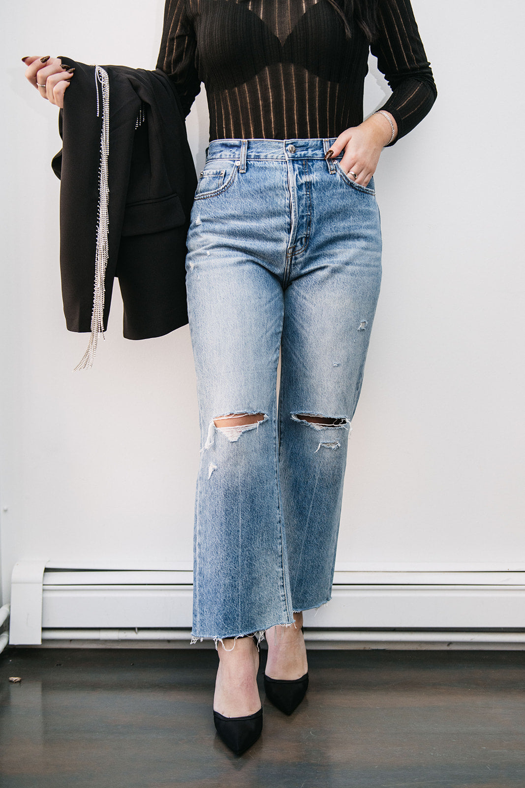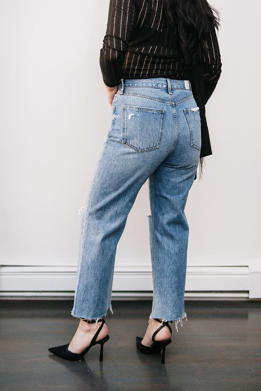 No sleep till Brooklyn. Super high rise waist with a composed straight leg silhouette and cropped ankle hem. Crafted from rigid non-stretch denim for an expert fit that holds its shape. Bushwick Distressed is a medium blue wash with fading, whiskering, and moderate distressing at the knees, finished with a scissor cut hem.