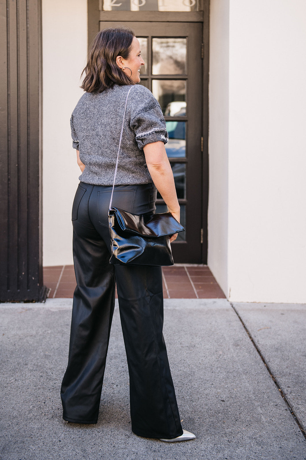 The cool girl fit, Far Out is a modern silhouette with front seams down the front to give the appearance of longer legs. In a waist defining high rise, this wide leg is crafted in a high shine, comfort stretch faux leather fabrication.