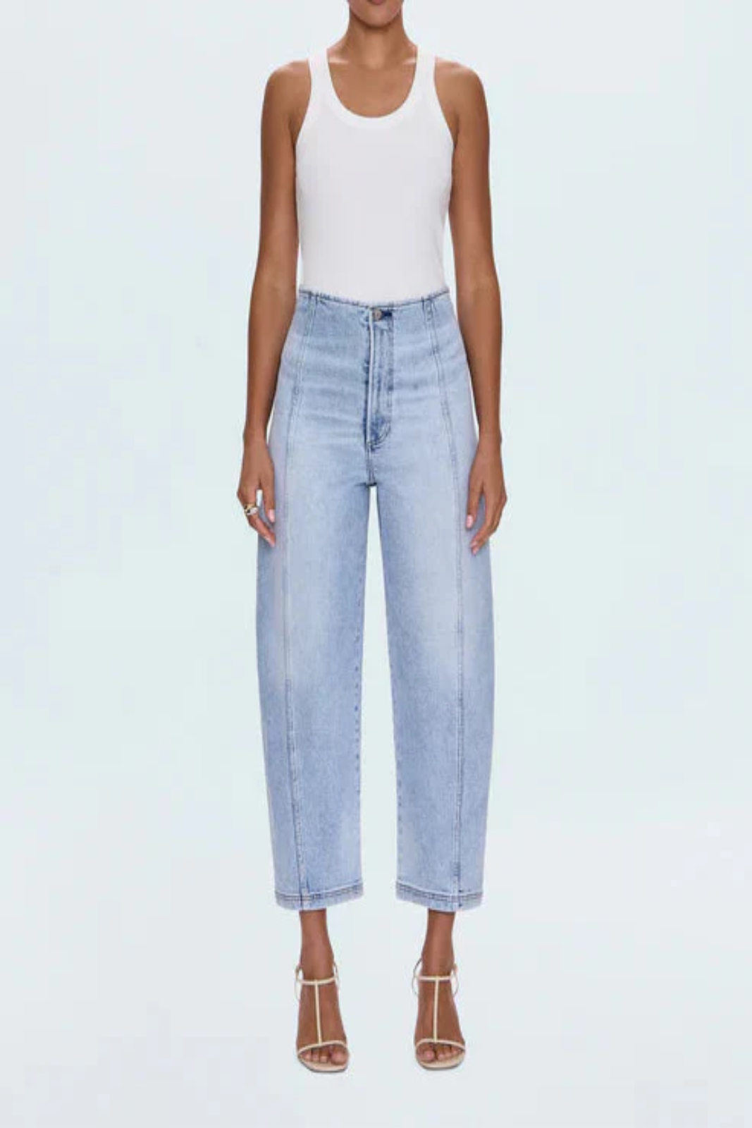 The ultimate cool girl denim. The Blair by Pistola sits as a high rise with a unique barrel silhouette that offers a modern twist on proportion, finished with a 27" inseam. The absence of a waistband creates a smooth, streamlined look that feels inherently sophisticated. Chic seaming details add elevated flair without effort.