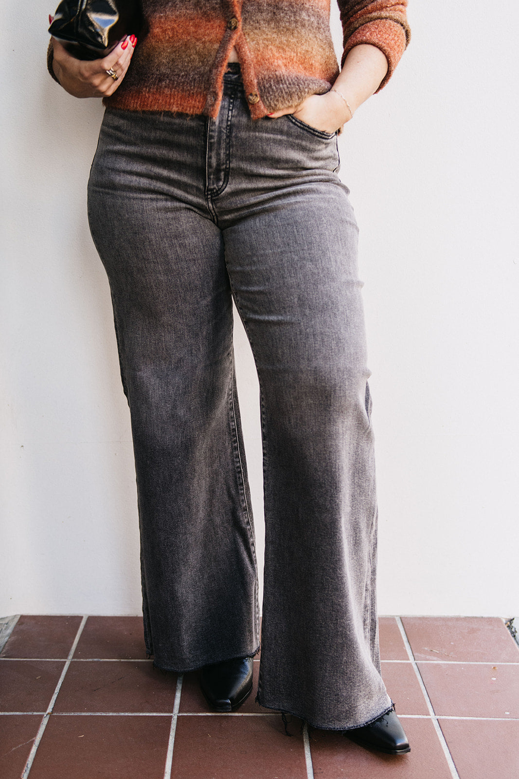 The Far Out in Milky Way is a high rise wide leg jean in a vintage-inspired faded black wash. This reliably flattering pair features a waist-cinching high rise and dramatic wide legs. This style is constructed from Daze's stretchy Repreve fabric, which gives recycled plastic bottles a second life — from waste, to waist.