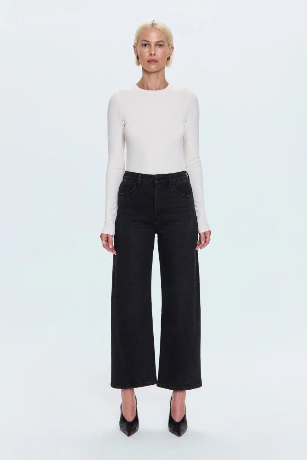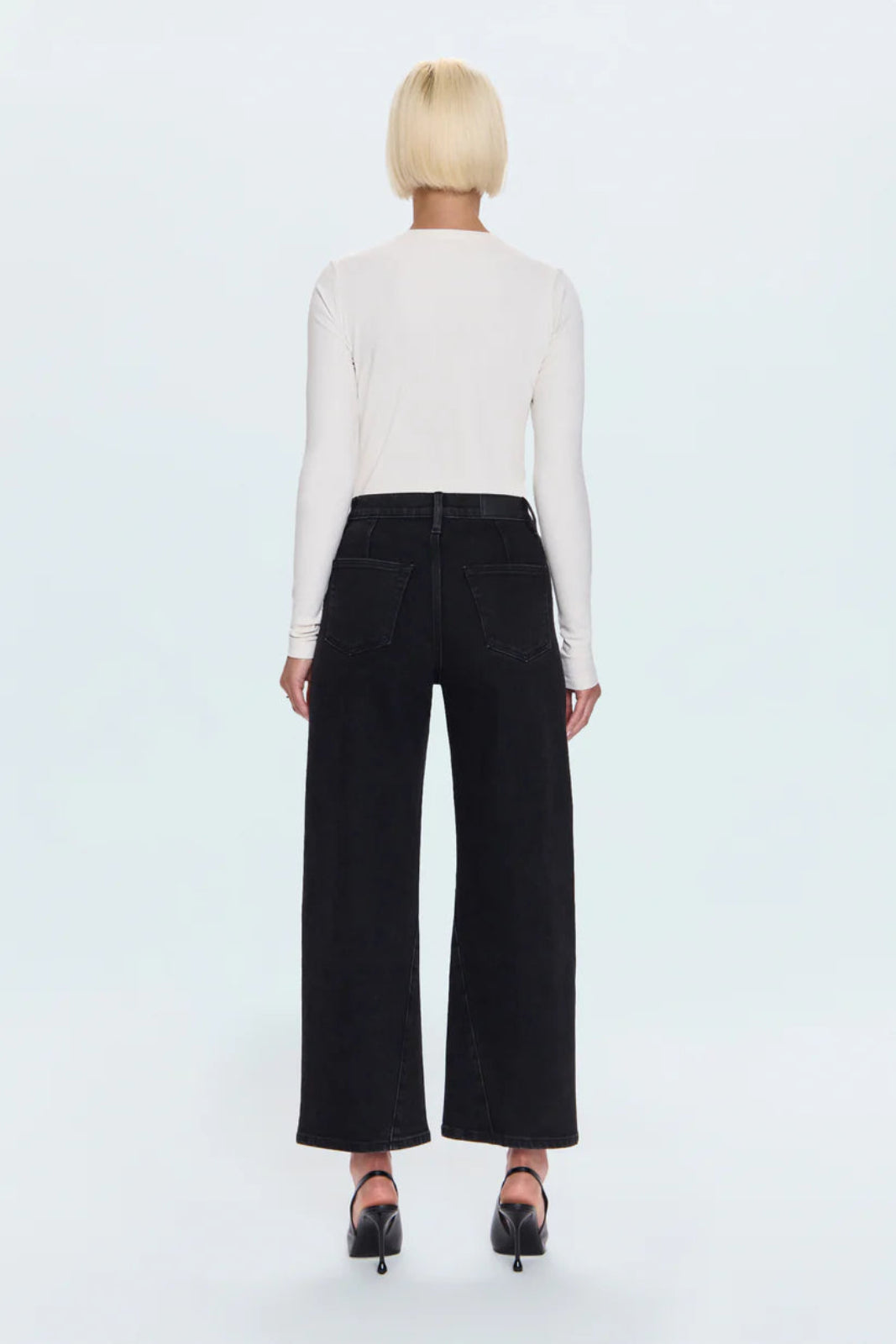 A new must-have jean, Kyra by Pistola features a high rise, signature bowed leg, and cropped 28" inseam for a fresh, sculpted shape. The forward-twisted seam and refined back yoke add subtle dimension and structure. Crafted from comfort stretch denim in Jetset, a sleek black wash with timeless versatility.