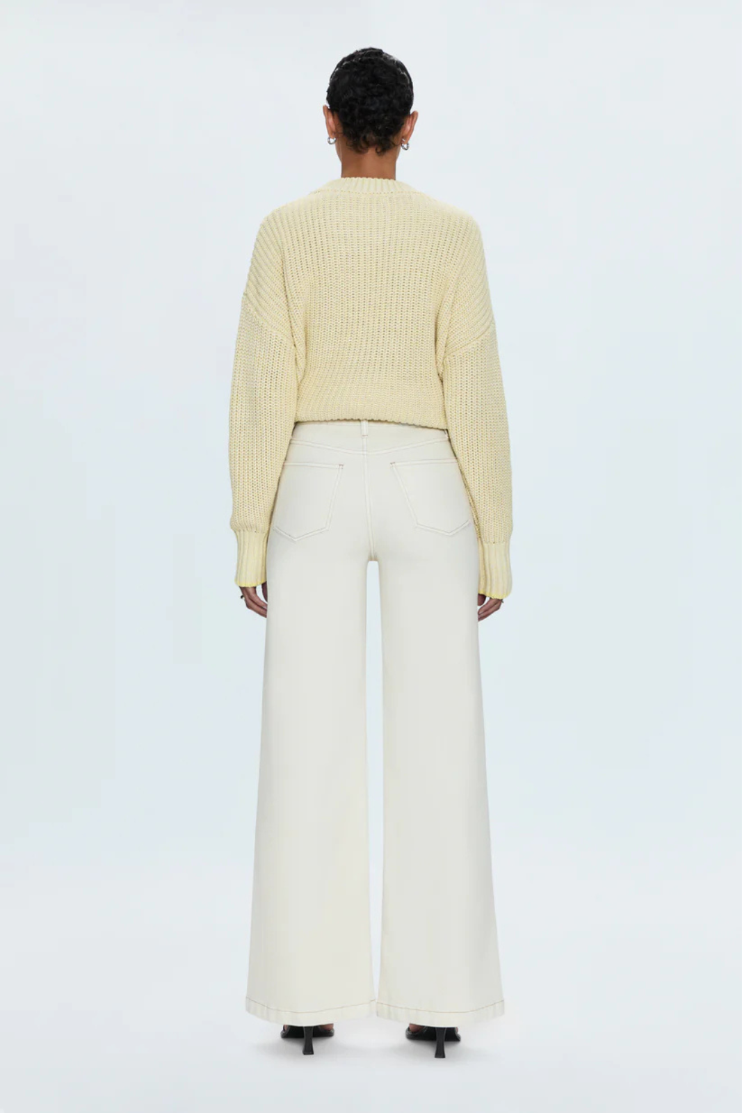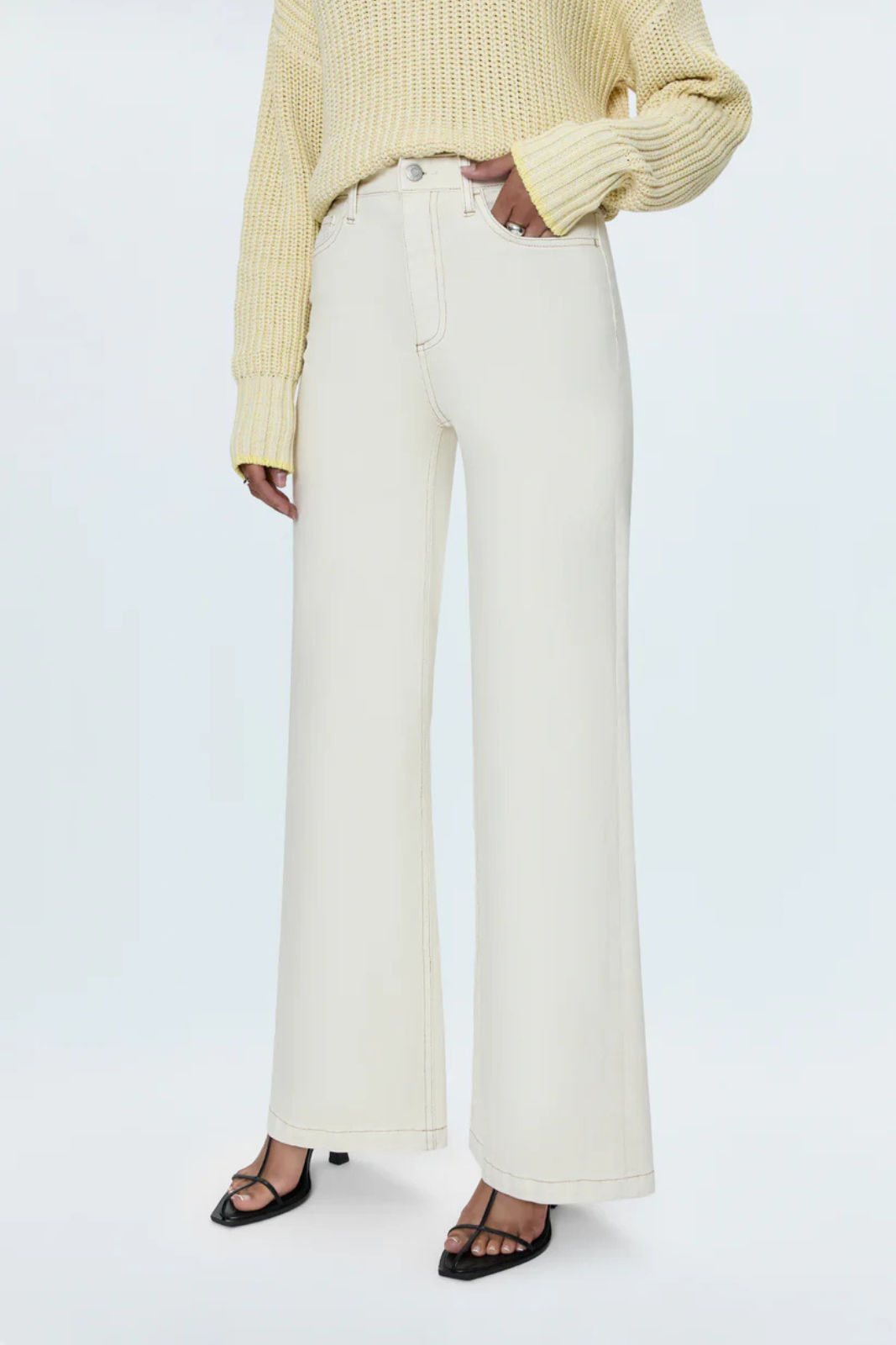 A relaxed, ultra wide leg silhouette with a high rise waist, breezy full length cut, and a clean finish hem. Crafted from Pistola's signature comfort stretch denim to provide a structured shape with just the right give. Ecru is a warm white colored denim wash with contrast stitching.