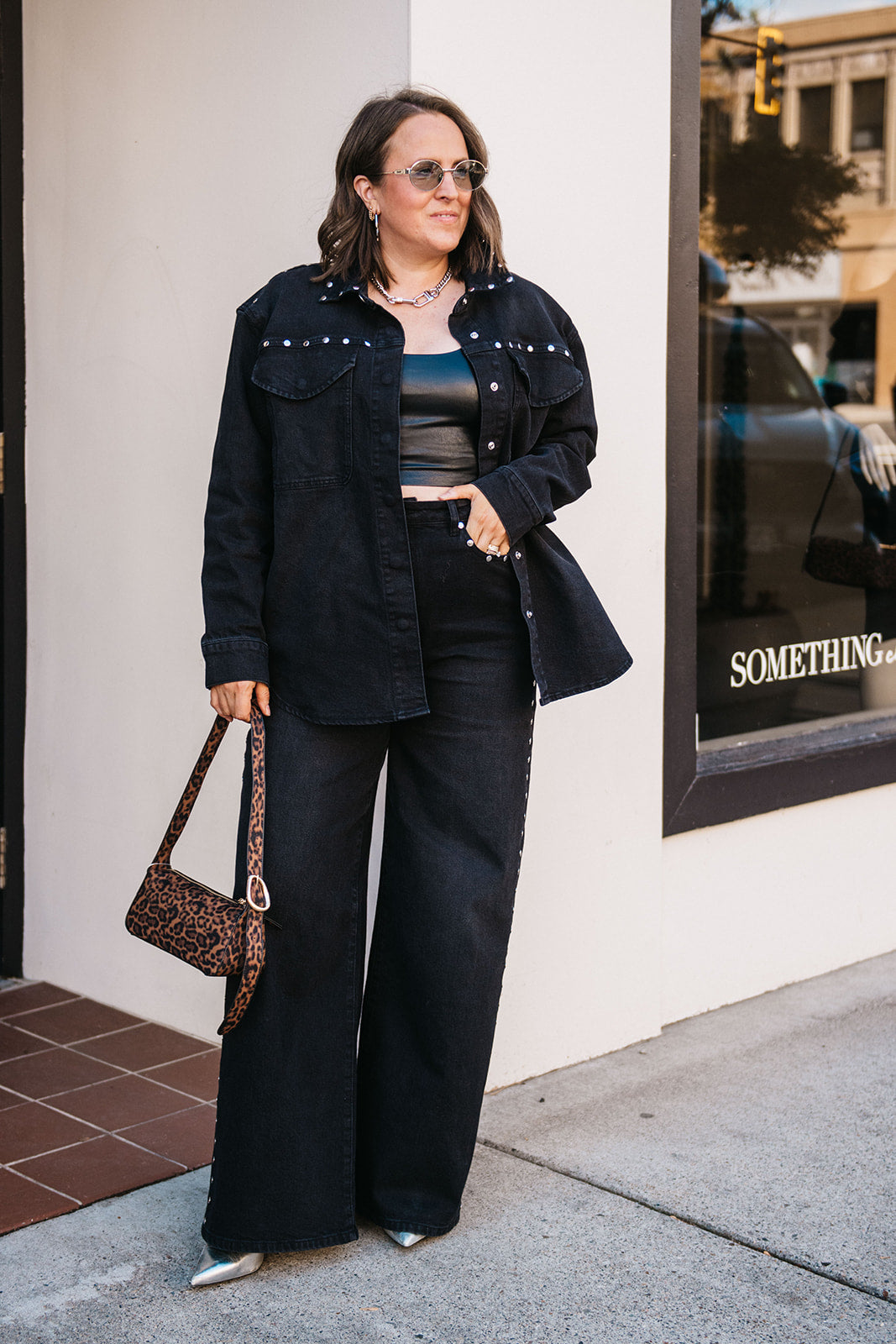 With a dramatic wide-leg silhouette and studded detailing that brings the edge, these jeans are built for bold looks and all-day comfort. Pair with a baby tee or the matching oversized jacket.