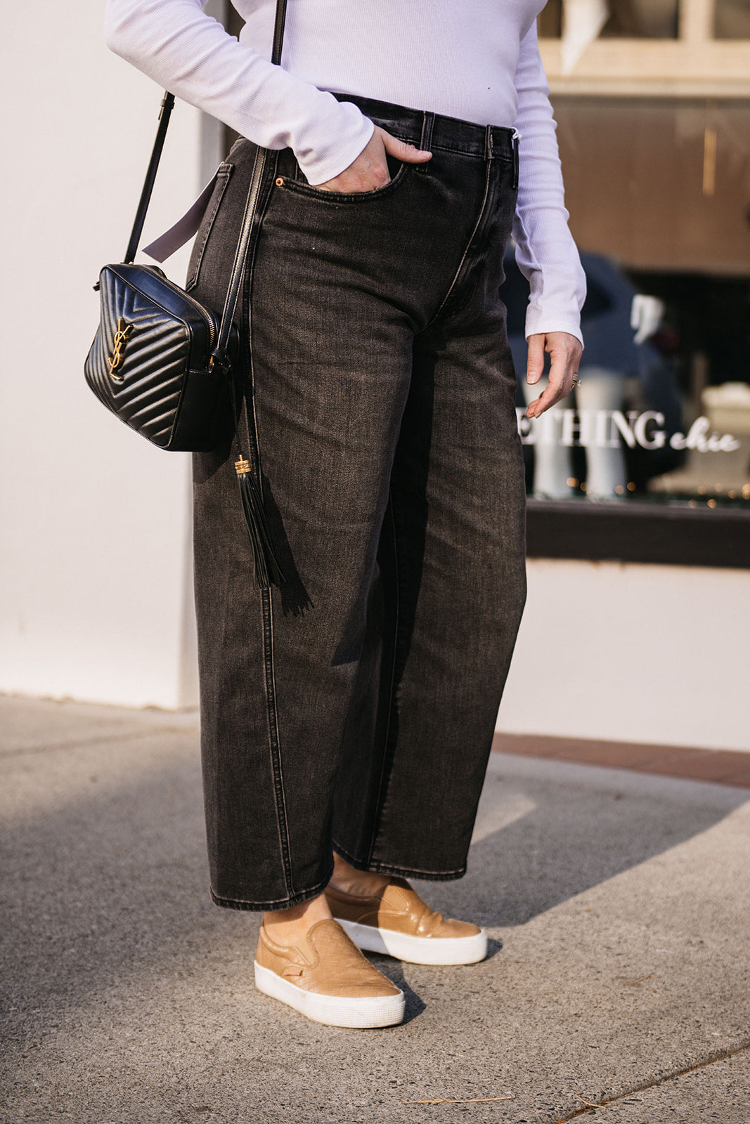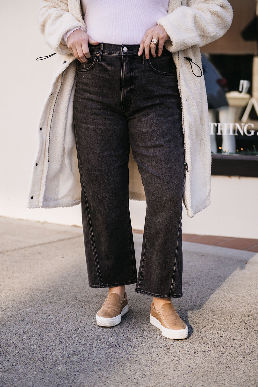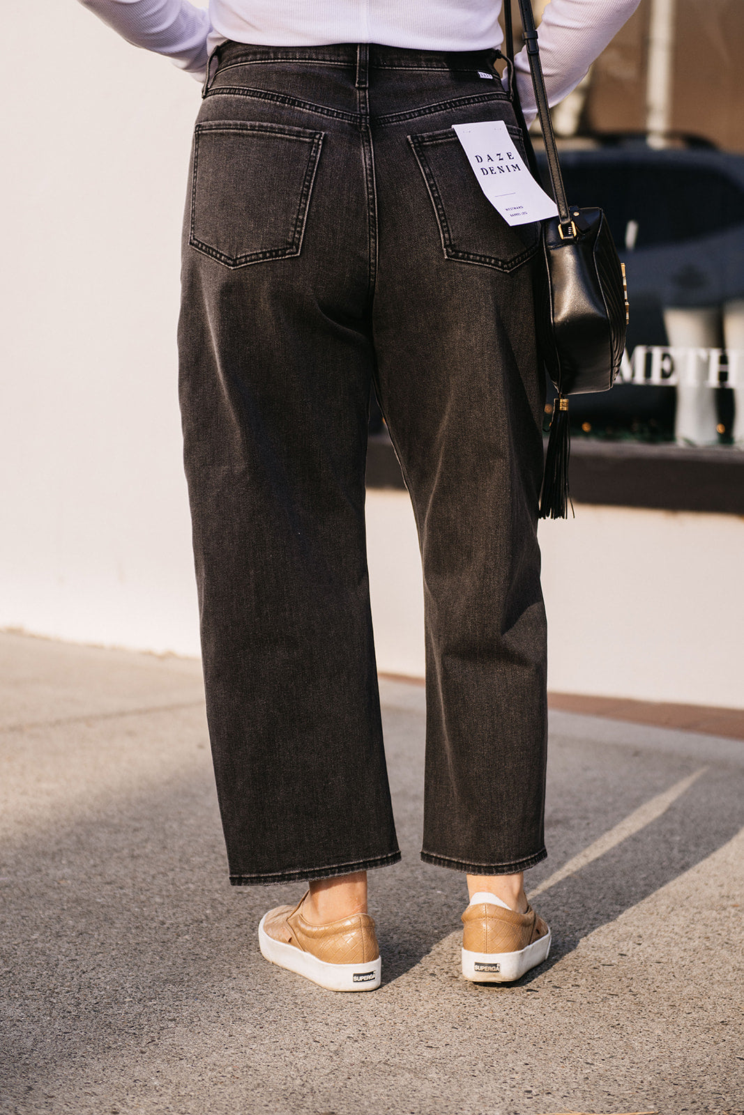 The Westward in Night Life Vintage is a high rise jean with a barrel leg silhouette. Featuring a cinched waist, bowed leg, and slightly tapered ankle against a faded black wash, this jean is as versatile as it is flattering.