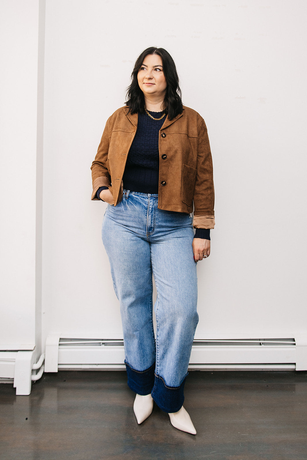 Soft texture meets modern structure in this boxy faux suede jacket. With its relaxed, oversized silhouette and buttery-smooth feel, it’s the perfect blend of laid-back and elevated. The boxy cut layers effortlessly over everything from knits to slip dresses, while the faux suede finish adds a luxe touch without the fuss. An easy go-to jacket that instantly polishes any look.
