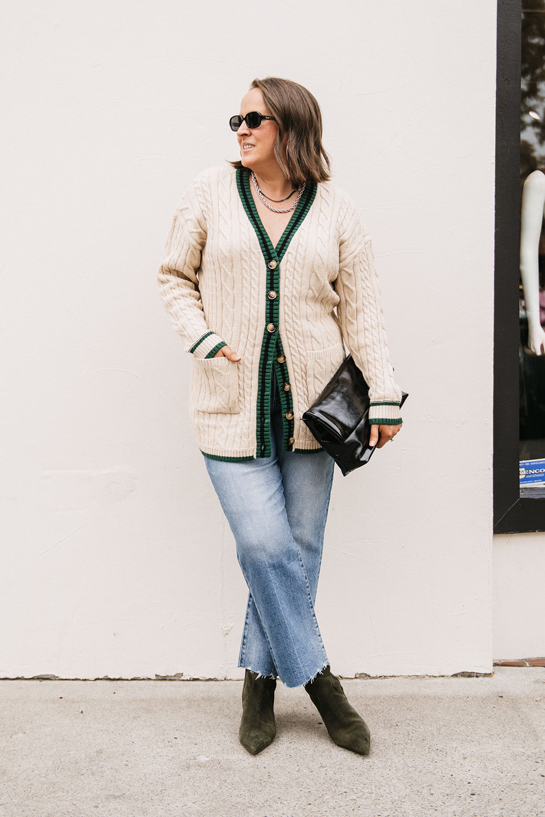 The Contrast Edge Cardi is a flattering, long line cardigan featuring a cable stitch throughout the body and contrast tipped edges around the neck, front edge and sleeves cuffs.