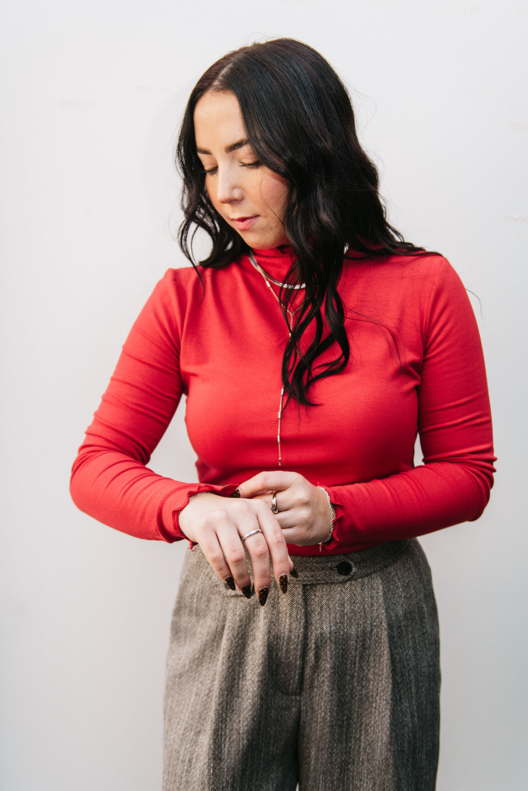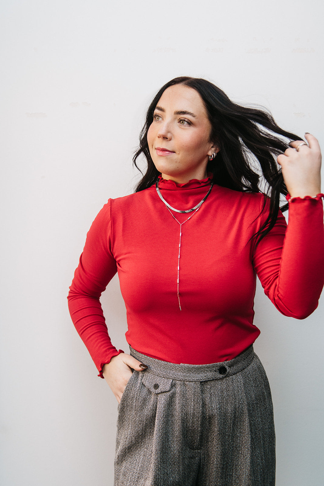 Chic, playful, and effortlessly stylish, this mock neck long sleeve top features subtle wavy trim detailing along the neckline and cuffs, adding a modern twist to a wardrobe essential. The fitted silhouette and clean lines make it versatile for layering under blazers or pairing with skirts and denim. A refined yet fun piece that elevates everyday outfits with a pop of red and personality.