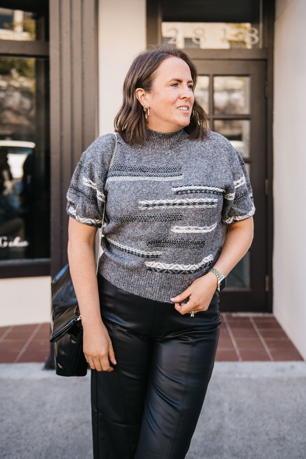 Subtle shimmer meets cozy comfort in this short sleeve knit sweater. Woven with delicate metallic threading, it adds a touch of sparkle without overwhelming your look. The relaxed yet structured fit makes it perfect for layering over skirts, trousers, or denim, while the short sleeves make it versatile for transitional weather. Effortlessly chic, it’s a wardrobe piece that brings a hint of glamour to everyday style.