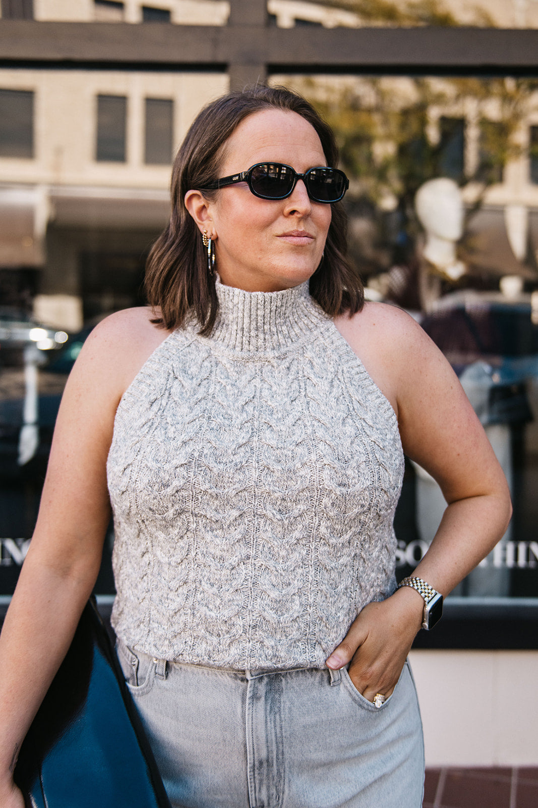 Textural cable stitches enhance the cozy vibe of this halter-neck sweater knit from shimmery, cotton-rich yarns in a fitted silhouette.