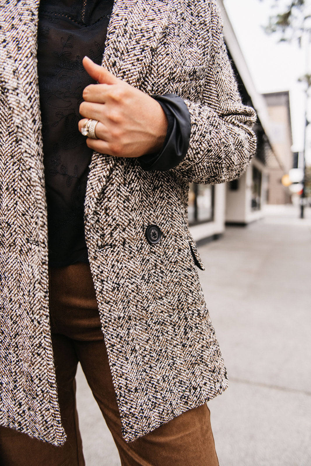A timeless classic with a modern edge. This double-breasted blazer is crafted in a rich tweed weave blending black, white, and camel tones for a sophisticated, wear-anywhere palette. The structured fit and sharp tailoring create a flattering silhouette, while the textured fabric adds depth and dimension. Perfect for elevating denim, layering over sleek trousers, or draping across your shoulders for that effortlessly chic finish. A statement piece you’ll reach for season after season.