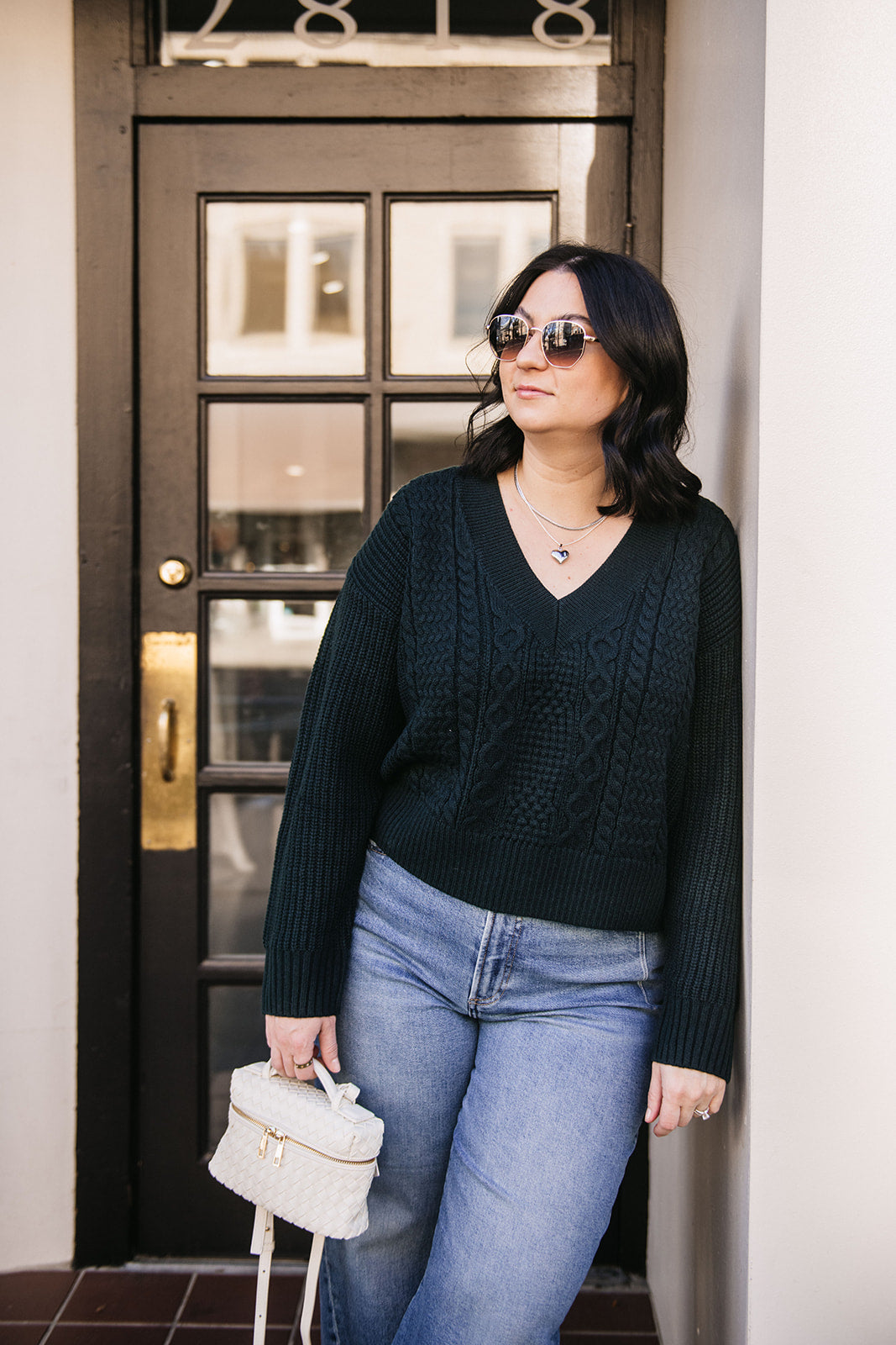 This sweater is made of a soft yarn in a gorgeous deep pine color and features include a v-neckline and cable knit details throughout. Wear it on its own or layer over a white crewneck tee.