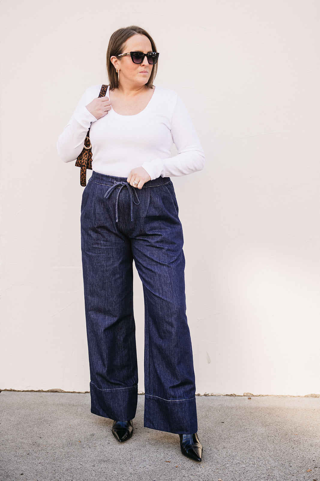 The Chambray Wide Leg Pants feature a high-rise fit with an elasticized drawstring waistband, slant pockets, and bottom cuff detail in a mid-weight, dark wash chambray. Cut in a relaxed wide-leg silhouette these pants are a fun alternative to a pair of jeans.